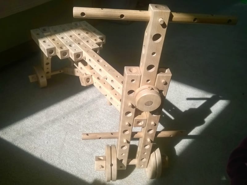 Jaký materiál by mohl být pro dětskou hračku lepší, než dřevo. Já dřevěné hračky miluju. Nejen, že jsou příjemné na dotek, ale kdyby přišla tuhá zima, tak si s nimi můžete zatopit. Sice pravděpodobnost, že k něčemu takovému dojde, je mizivá, ale ta možnost tady prostě je. To nepopřete. A to, že se tahle stavebnice jednou nebude válet na skládce, mě naplňuje zvláštním klidem.